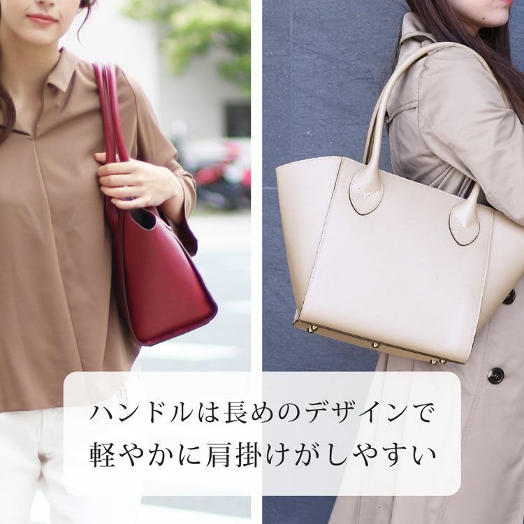 ハンドルが長めのデザインなので、肩掛けもしやすい造りになっています。両手が自由に使えるので、通勤バッグとしてもおすすめです。