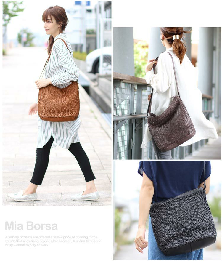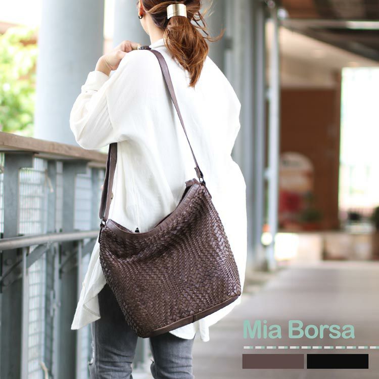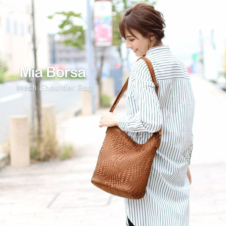 本革 メッシュ ショルダーバッグ レディース Mia Borsa ウォッシュ加工 牛革 イントレチャート 編み込み 大容量 斜めがけ 肩掛け ウォッシュレザー メッシュバッグ 夏 夏バッグ ギフト ladiesbag