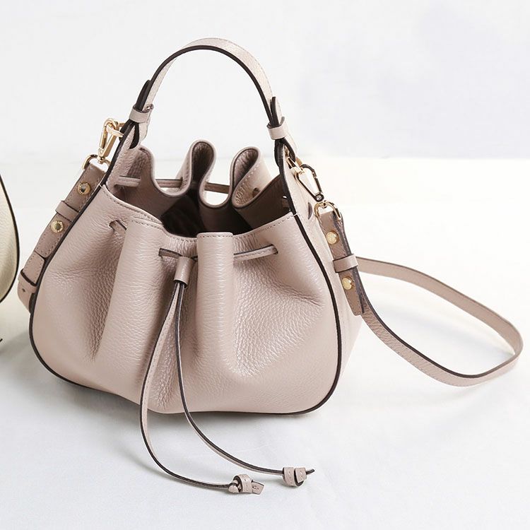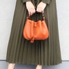 レザーバッグは、統一感がありつつも、巾着部分が目立ち、華やかな印象を与えます。