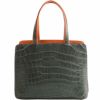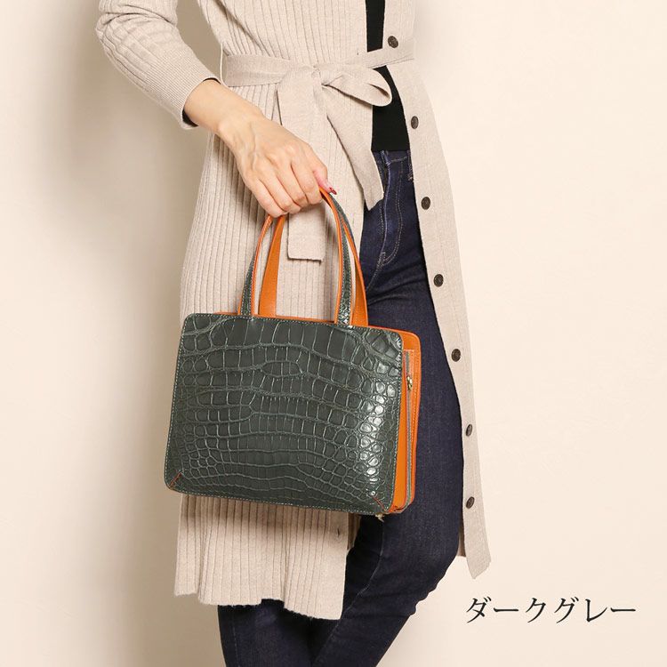 ダークグレーのバックを購入しました。色の組み合わせがとても素敵でとっても気に入って居ります。なかなか無い色合いでオレンジがとても綺麗な色です。勿論、クロコのグレーも落ち着いた色合いでコントラストが最高です。日々、大活躍しそうです。欲を言えばあと一回り大きいともっと使い勝手が良いのと、ショルダーベルトも表はダークグレーのクロコ、裏がオレンジだと肩にかけても素敵なんですがねー。