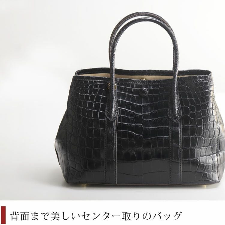 ナイルクロコダイルの腹部の革をバッグの中央に配したセンター取りで、バッグの中央から左右対称のように美しい腑模様が並び、エレガントな印象です。