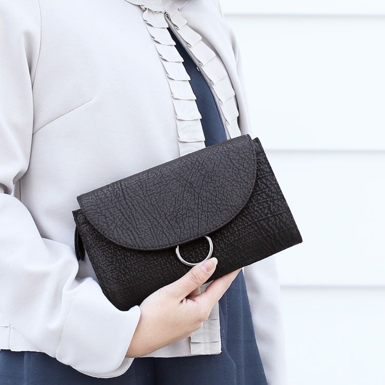 ブラックの模様が美しいシャークスキンを使用。天然素材ならではの細かい凹凸が特徴です。落ち着いた大人の気品を感じさせてくれる素材です。使っていくうちにざらざらとした質感から艶のある質感へと変わっていくエイジング(経年変化)も魅力のレザーです。