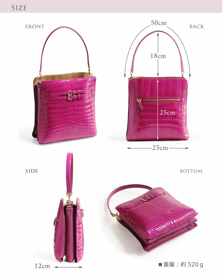 | 素材 | 表側:クロコダイル 内装:牛革(本革)、シャンタン生地 (表面の側面、底面、ハンドルの裏側は牛革を使用) |