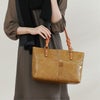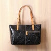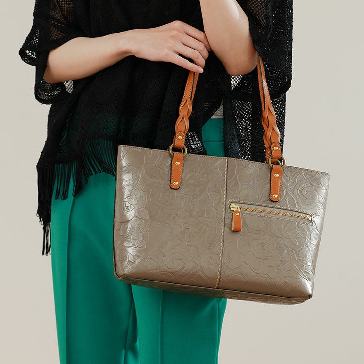 ローズの花柄を牛革に型押しした革で仕立てた本革トートバッグ。