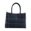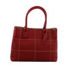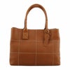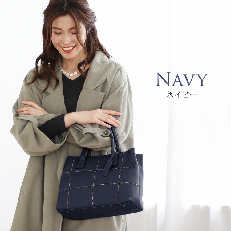バッグの正面に格子状のステッチがデザインされた牛革ハンドバッグ。