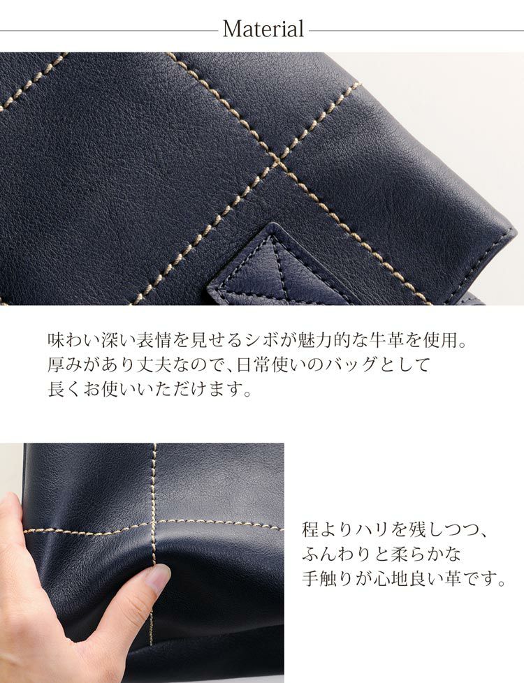 ふんわりと柔らかく、滑らかな手触りが心地良い牛革を使用しています。