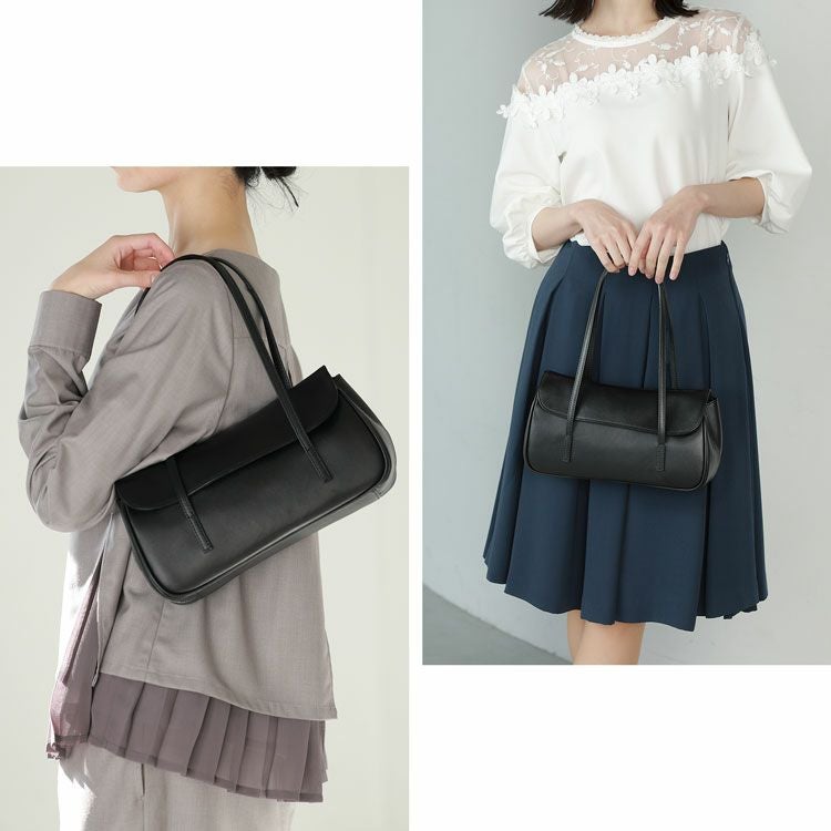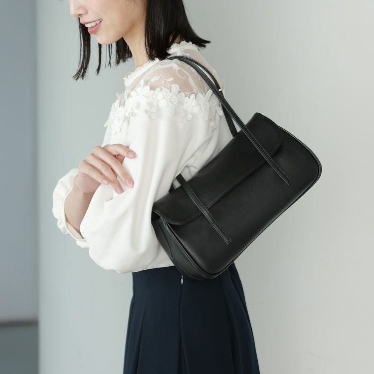 ブラックカラーの上品な光沢感が美しい牛革フォーマルバッグ。