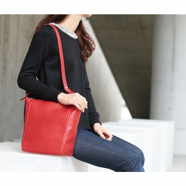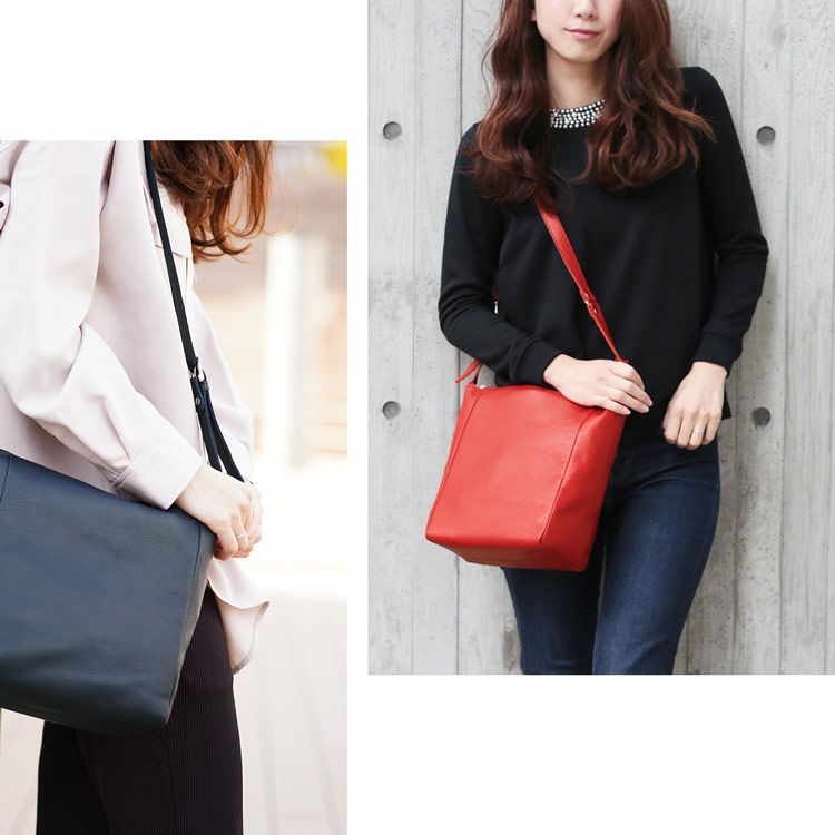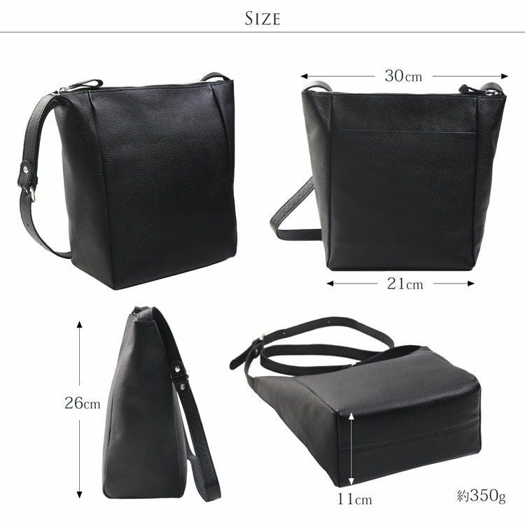 丈夫で滑らかな肌触りの日本製の牛革を使用。 革らしさを感じるシボと落ち着いた光沢があり、 使い込むほどに変化する経年変化を味わえます。 くたっとした柔らかな質感で、 長年愛用してきた革のような心地よさがあります。 また、使わないときは畳むことができるので 収納や旅行での持ち運びにも便利です。 革の表面には水を弾く撥水加工を施しています。 水分が付いても、革の内部に染み込みにくいので、 急な雨や飲み物をこぼしてもハンカチで簡単に拭き取れます。 こちらの商品は約350gでりんご一個分と同じくらいの重さ。 バッグの重さを気にせず軽やかにお出かけすることができます。 バッグの内側にも外側にもポケットがあり、 スマートフォンやキーケースなどの小物の収納に便利です。 内側前面:フリーポケット×2 内側背面:ファスナーポケット×1 外側背面:フリーポケット×1 開口部はファスナーで開閉。 ショルダーベルトはバックルで長さ調節ができます。 [ 85?103cm / 4.5cm間隔で5段階 ]