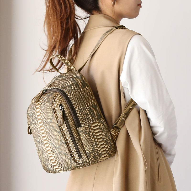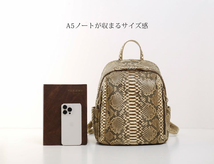 ※キーワード:蛇革 軽量 軽いかばん パイソンバッグ レディースリュック 背中ポケット 両開きファスナー