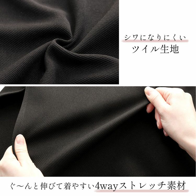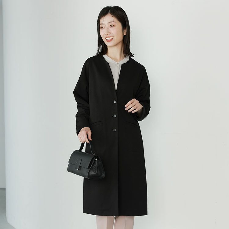 すらりとした縦長の印象で美しいラインが決まるノーカラーコート。 カジュアルにもフォーマルコートとしても使えるシンプルなデザインです。 裏地なしの4wayストレッチ生地を使用しているのでスッと体に馴染み、とても着心地が良いコートです。 伸縮性に優れ、シワになりにくいツイル生地を使用しています。 柔らかな風合いで肌触りの良い着心地です。 美ラインでシンプルなブラックコートは、大人カジュアルな普段使いから 結婚式、卒業式、入学式など冠婚葬祭のブラックフォーマルにも使え、 一着あると重宝します。 顔周りをすっきりとした印象で、上品な雰囲気のノーカラーコート。 シンプルなデザインだからこそシーン別で着回し可能。 ノーカラーの襟元はタートルネックやパーカー等と相性が良く、 コーディネートの幅の広がるデザインになっています。