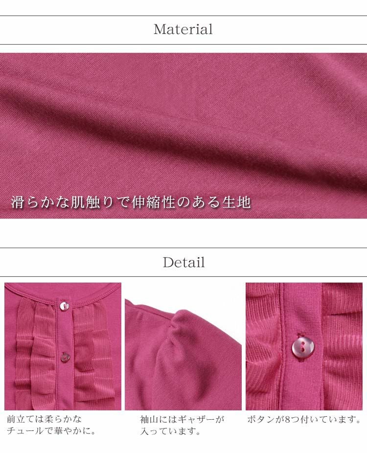 チュニックの前立てには柔らかなチュールがあしらわれ、華やかなデザイン。