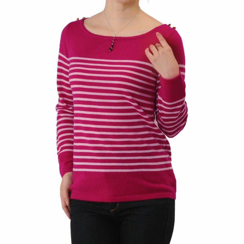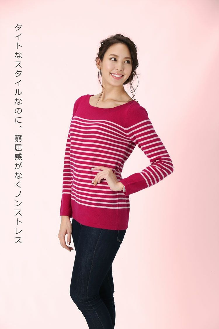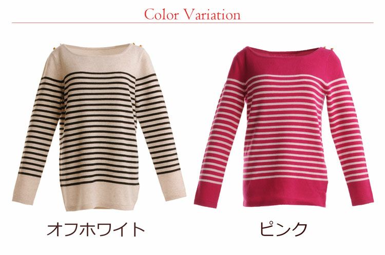カシミヤ セーター レディース カシミヤ100% ボーダー ニット 定番 カジュアル カシミヤ100% ボーダー柄 ハイゲージ ボートネック ゴールド ボタン ホワイト ピンクcashmere 女性 母 プレゼント ギフト