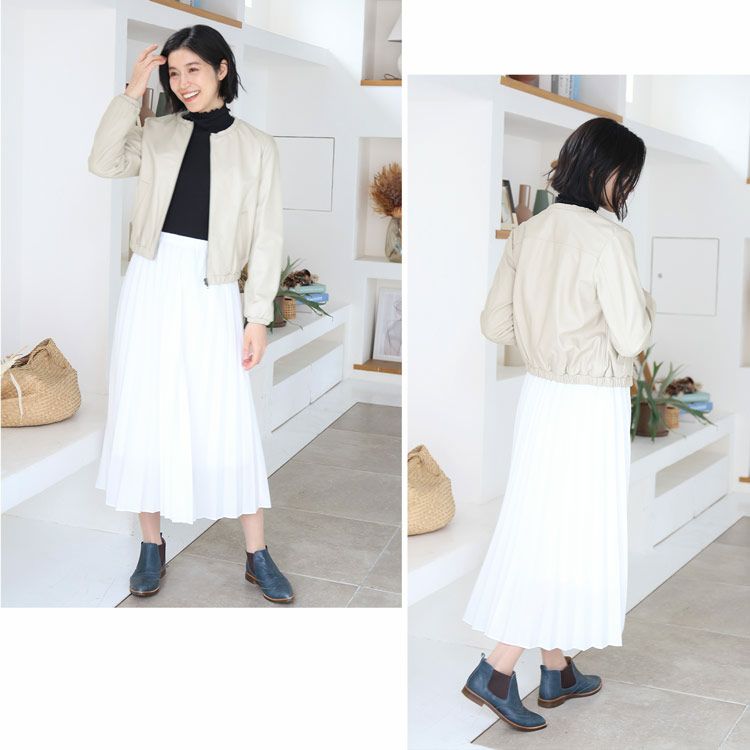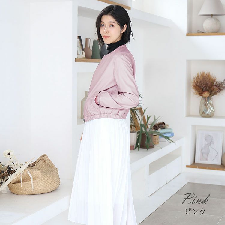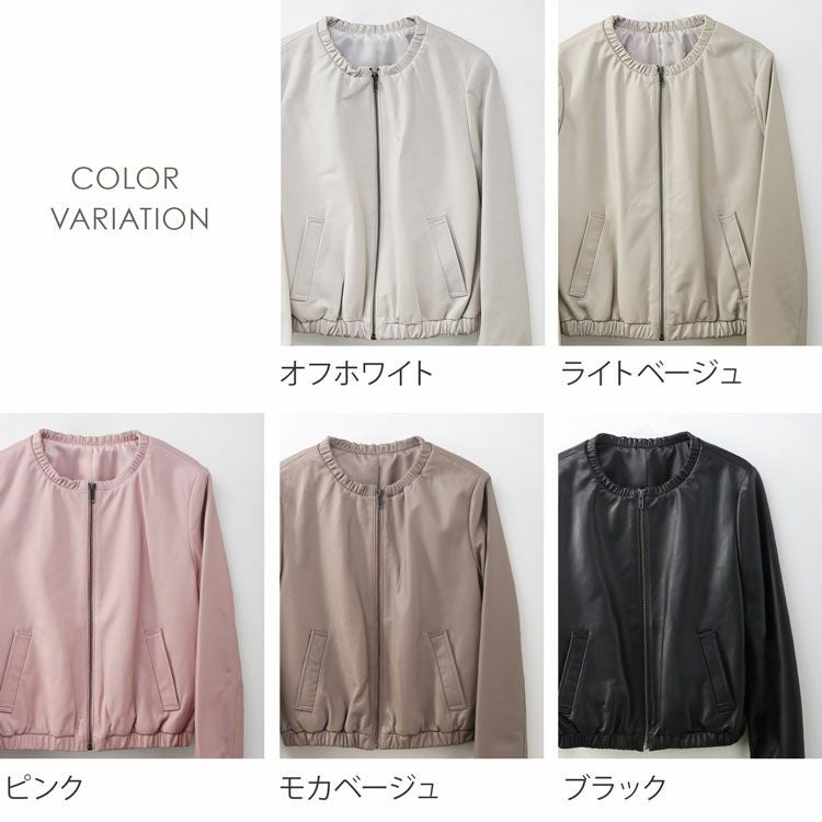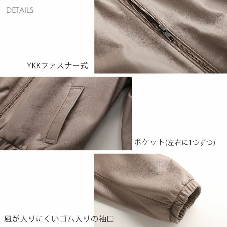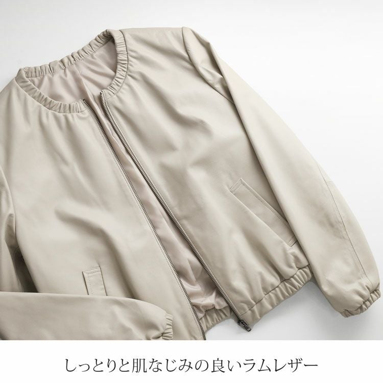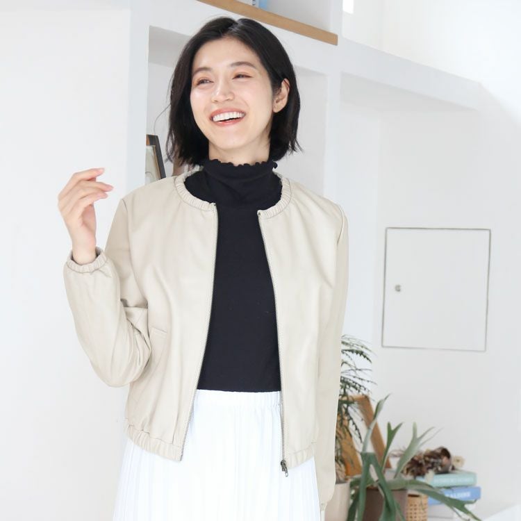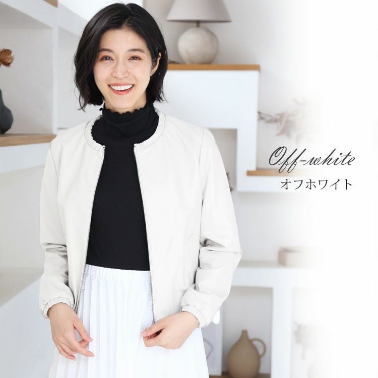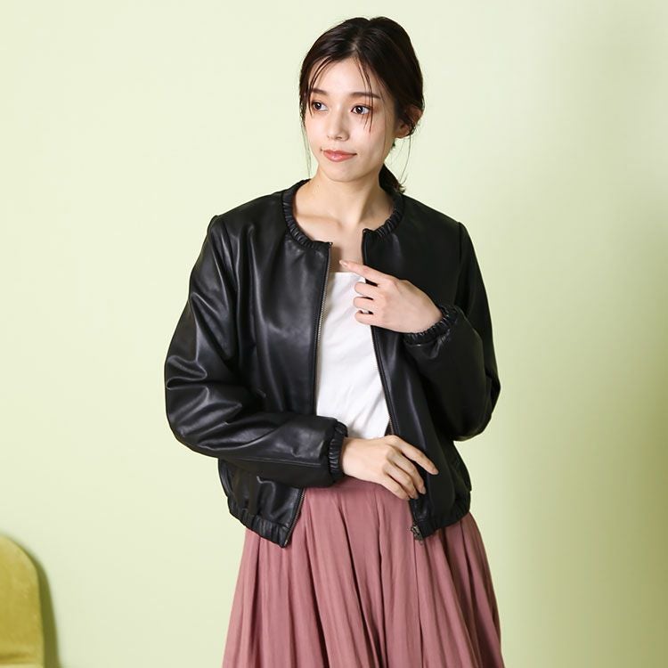 柔らかなラムレザー(子羊革)の レディースライダースジャケットです。 裾回り、袖口、首回りにゴム入りで ギャザーデザインになっており、 可愛らしくて女性らしい 丸みのあるシルエットで着用できます。 きめが細かく柔らかで、袖を通すとスッと ボディラインに寄り添うような 肌なじみの良さが魅力のラムレザー。 風を通さないので暖かく、軽やかさも 兼ね備えているラム革は アウターにぴったりの素材です。 裾回りはゴム入りのギャザーなので、 前開きを閉じたときに、 裾から風が入ってくるのを しっかりと防いでくれます。 ノーカラーのジャケットは 首元がすっきりしているので 襟を気にせずに、マフラー等を すっきりと巻くことが出来ます。 ↓モデル着用アイテム↓リネン風マフラーはこちらシルクタッチマフラーはこちら