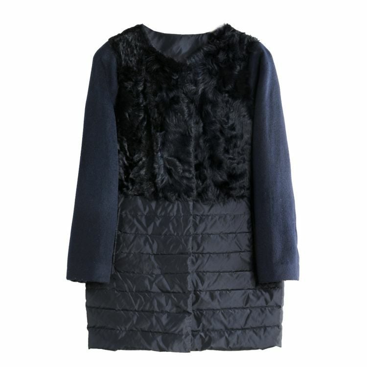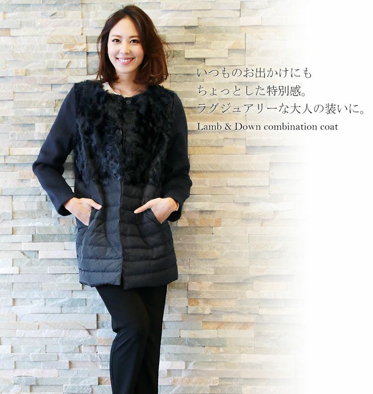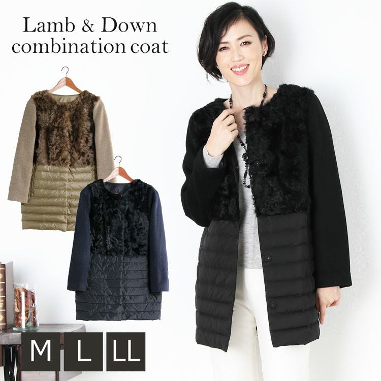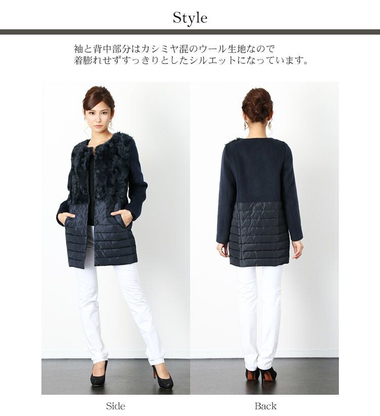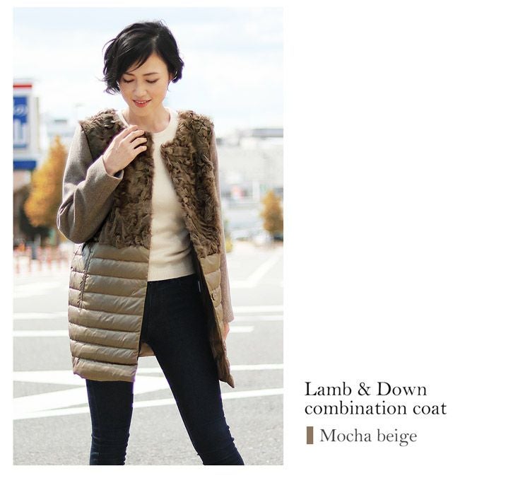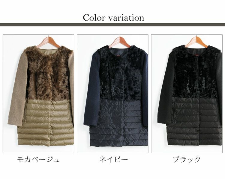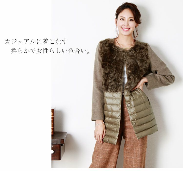 カルガンラム ダウン コンビネーション ノーカラーコート/レディース ダウンコート ファー付き カシミヤコート 冬 異素材 ノーカラーコート ミディアム 30代 40代 50代 ギフト プレゼント ギフト