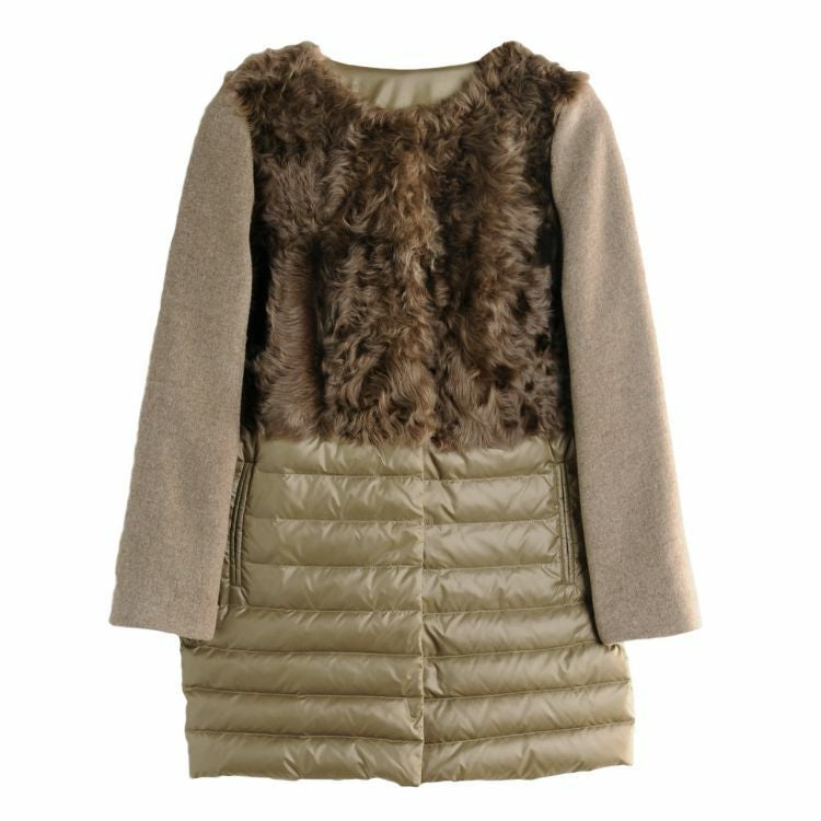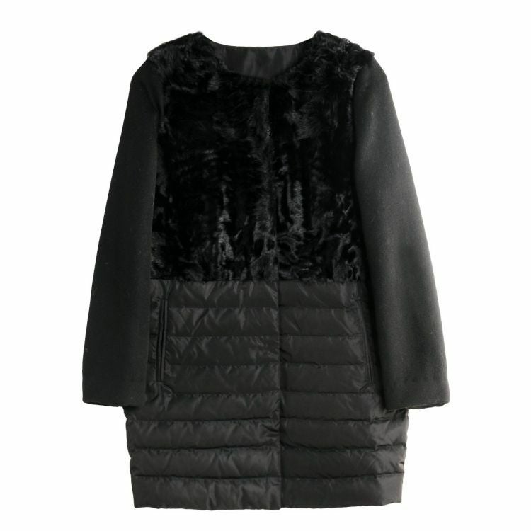 カルガンラムとダウンを組み合わせた異素材コンビのノーカラーコート。