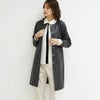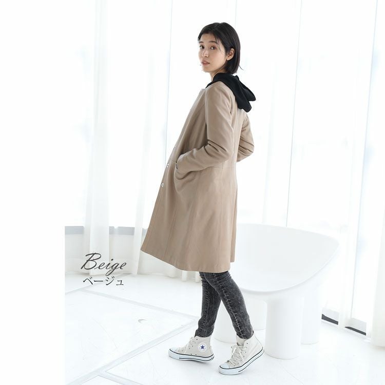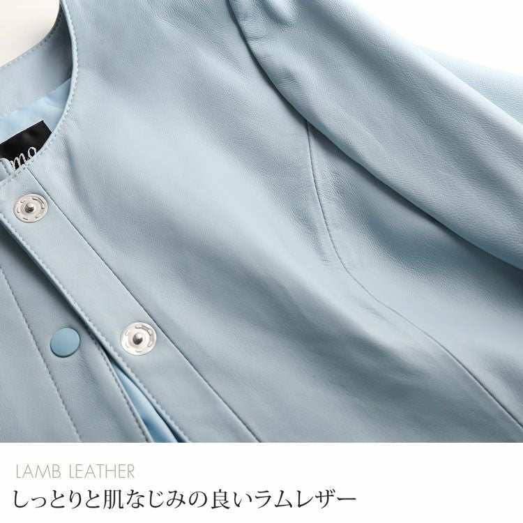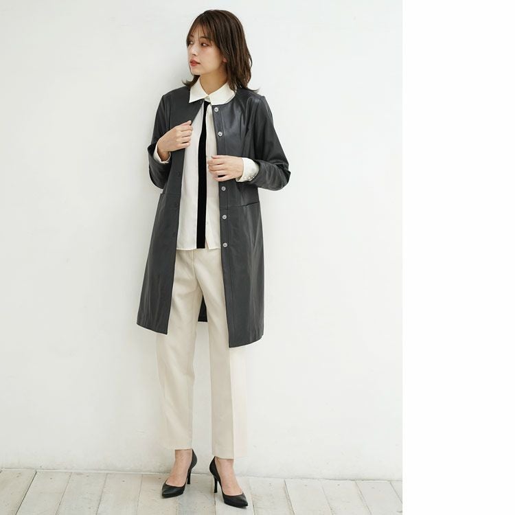 ラムレザーを使用したシンプルデザインのノーカラーコート。