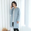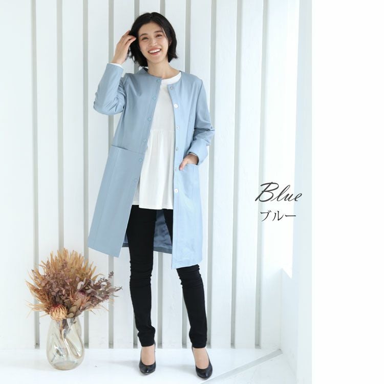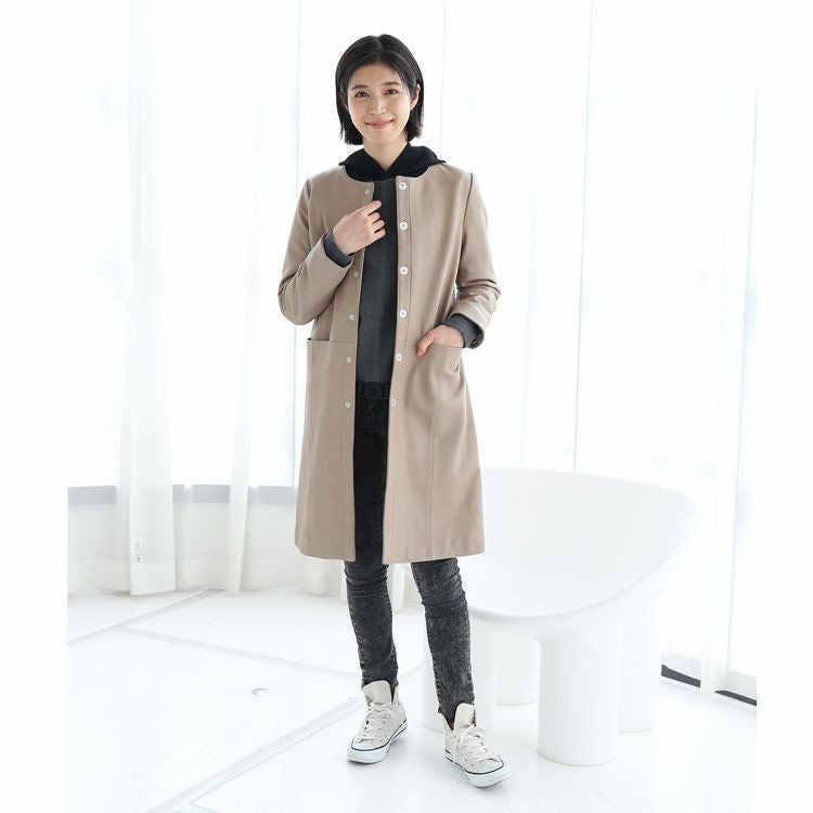 顔回りがすっきり際立つノーカラーデザインは、アクセサリーやマフラーなど