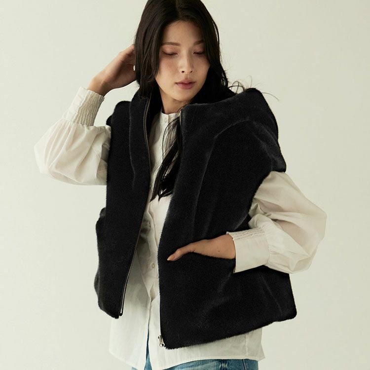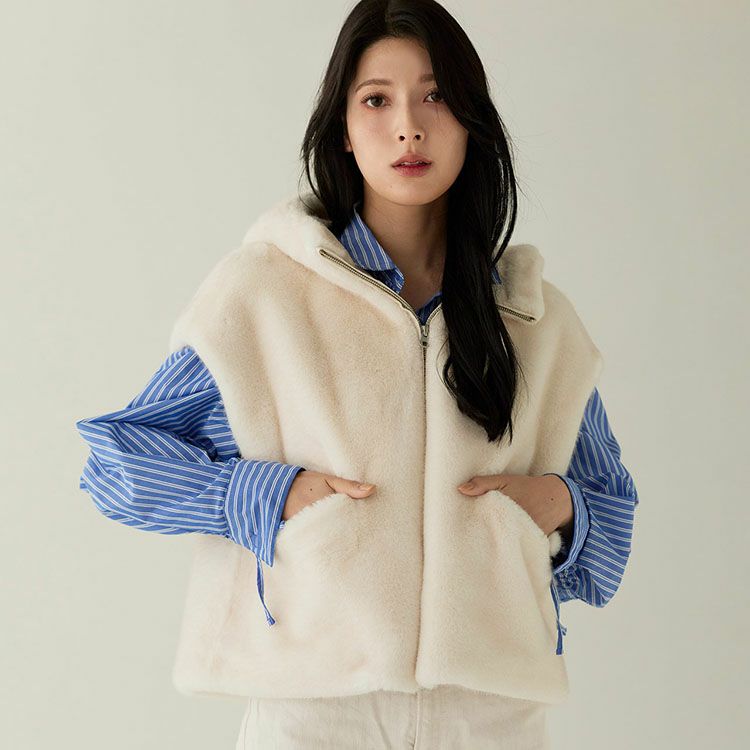 ボリューム感のあるビッグシルエットとショート丈のバランスが絶妙なフェイクファーベスト。