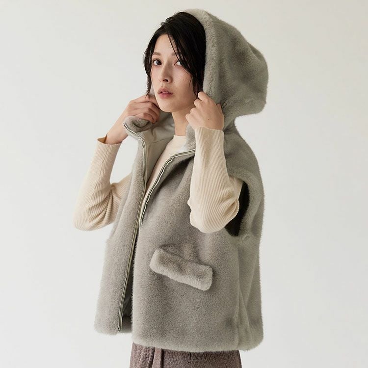 | 商品名:Filomo/フィローモ ミンク調 フェイクファー ファーベスト フード付き ショート丈 レディース エコファー ベージュ/グレー/ブラック |