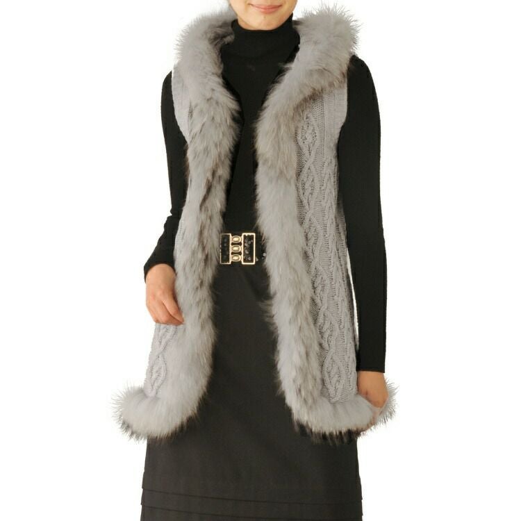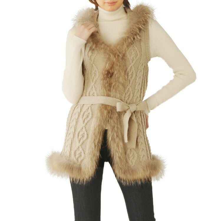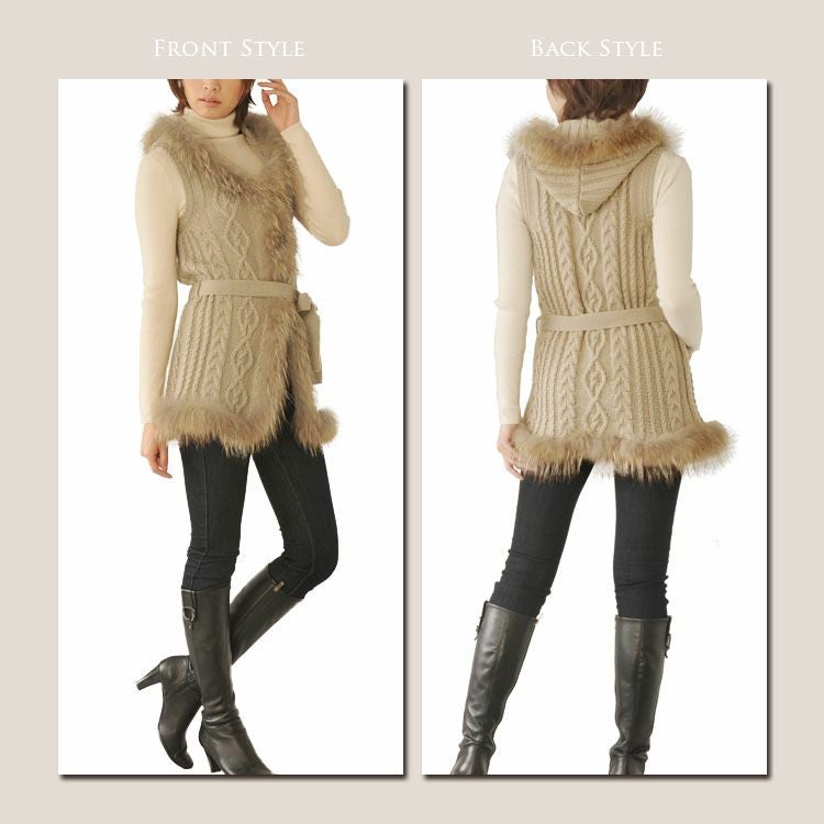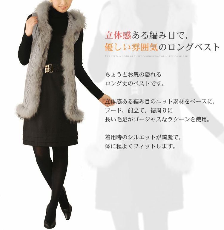 毛皮 ファー ラクーン ニット ロング ベスト フード付き アウター Vest べすと ラクーンフアー レディース ローゲージ 母 女性 プレゼント ギフト