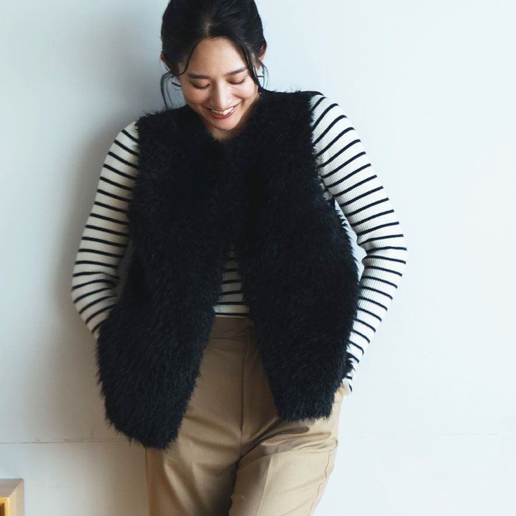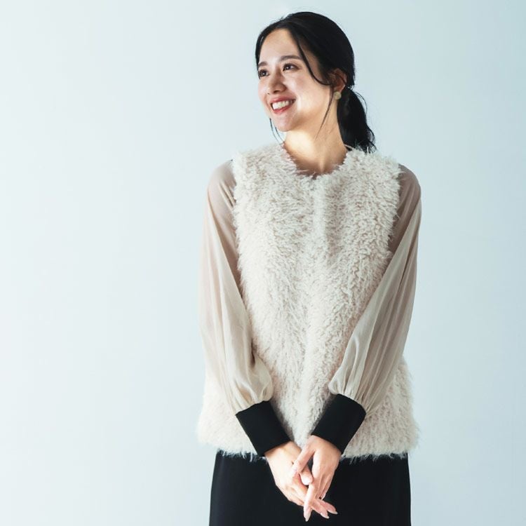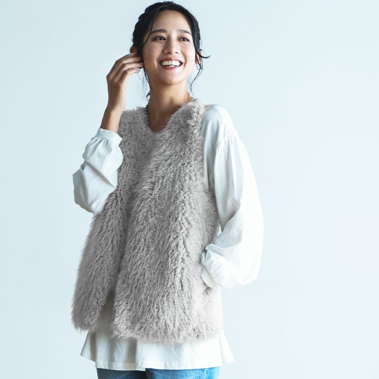 さっと羽織るだけでいつものワンピースもイメージチェンジできます。カジュアルでもフェミニンでも着こなせる、 着回し力抜群なファーベスト。