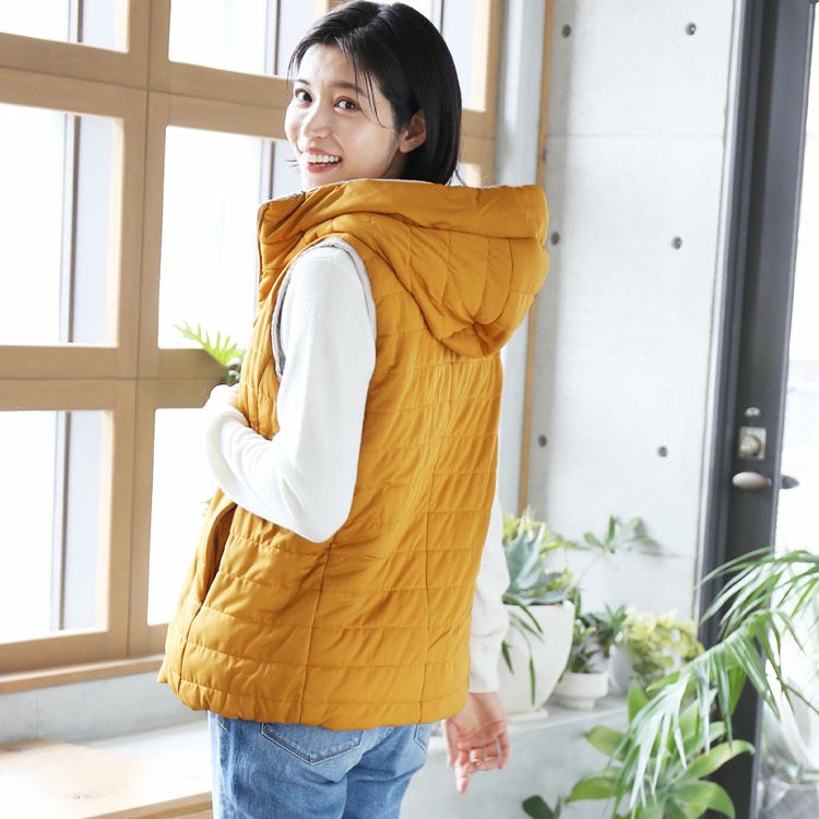 ちらっと見える鮮やかなマスタードカラーがかわいいダウンベスト。