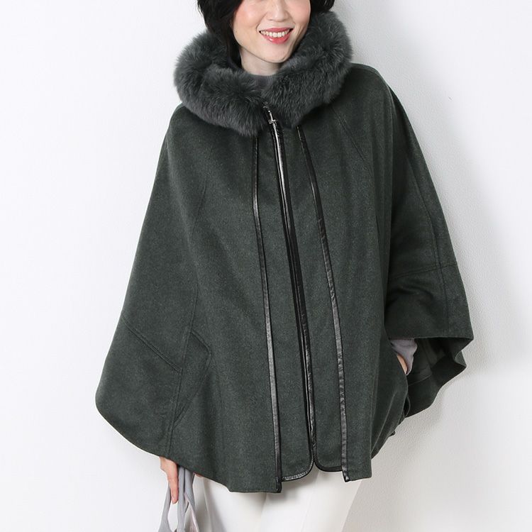 | 商品名:カシミヤ100%マント ラムレザーパイピング FOXフードトリム(No.02000047) |