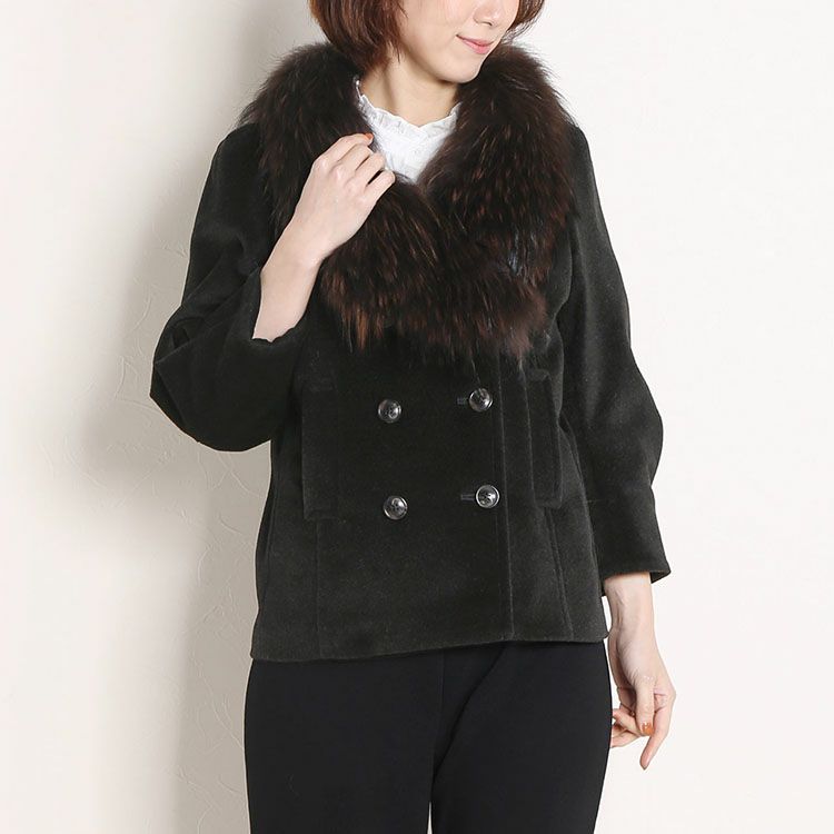 襟にボリュームたっぷりのラクーンファーが付いていて、とても華やかな印象を与えてくれます。 ファーは取り外し可能で、襟を外せばピージャケット風に着用できます。 少し短めでふんわりシルエットのバルーン袖が印象的。 かわいくおしゃれな雰囲気のジャケットです。 60cmの短め丈は色んなボトムスに合わせやすいコーディネート上手なジャケットです。 カジュアルにもフォーマルにも使え、オン、オフ問わず着られます。 またダブルの合わせなので、暖かく着用出来ます。 しっかりとした厚みのある、アンゴラ65%とウール35%の素材を使用しています。 アンゴラは軽く、なめらかで柔らかな手触りが特徴的でとても暖かい素材です。 長くゴージャスな刺し毛と柔らかな綿毛が特徴のラクーンファー。 首元はとても暖かくマフラー要らず。 ラクーン襟はボタンで取り外しができます。