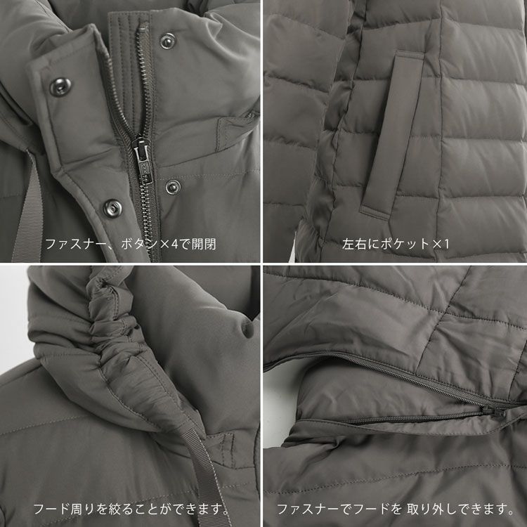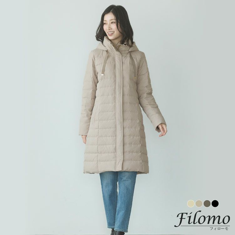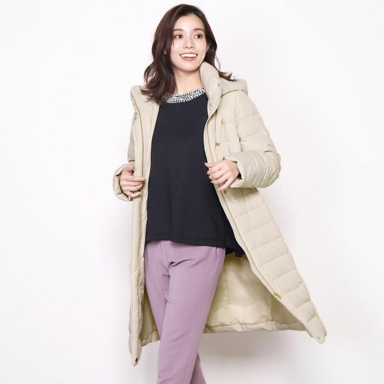 スタンド襟とフードで防風対策、保温性抜群。 適度な広がりのAラインシルエットが女性らしさを印象付けるダウンコート。 フード付きデザインで、デイリーカジュアルに使えます。 ◇ライトベージュ◇ 優しい色合いでやわらかい印象と清潔感のある大人の女性らしい雰囲気を演出。 ◇カーキ◇ ミリタリーな印象のカーキ。上品になりすぎない色合いで様々なスタイルに合わせられます。 ◇ブラック◇ 色んなコーデに合わせやすい定番カラー フードの絞りにはグログランテープを使用しています。 先端の金属パーツが光沢のあるリボンと 相性が良く、オシャレなデザインです。