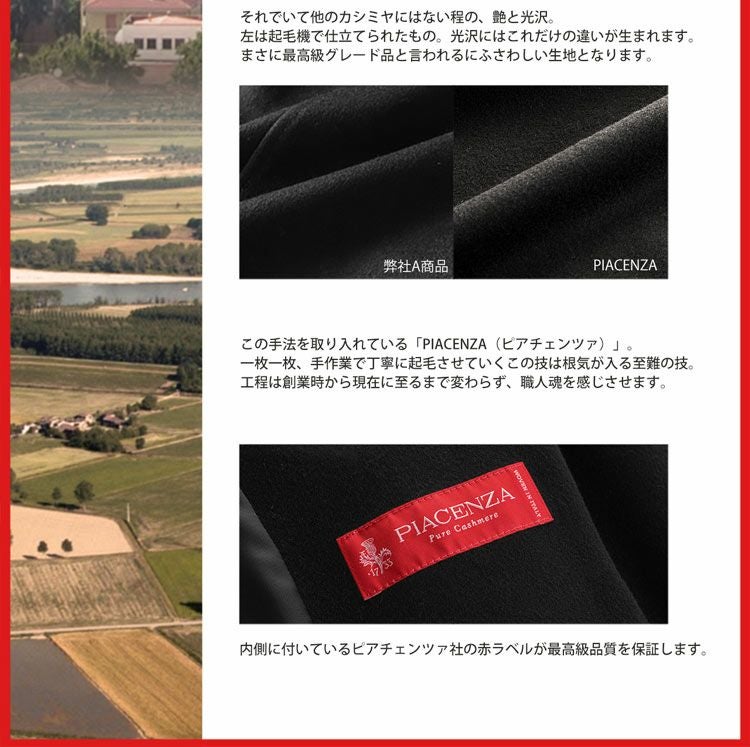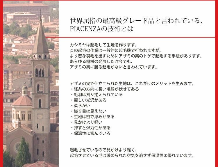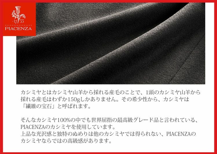 | ブランド紹介 | イタリアの歴史ある老舗テキスタイルメーカー「PIACENZA(ピアチェンツァ)」。ピアチェンツァのカシミヤは、生地の表面をアザミの実を使って丹念に起毛させる職人技術で仕立てられており、世界屈指の最高級グレード品と言われています。 |