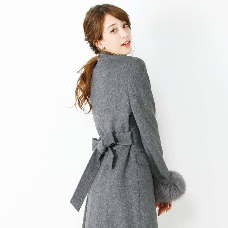 カシミヤをブレンドしたウールの着丈100cmのロングコート。 すらりと長い着丈にウエストベルト付きで、 綺麗なシルエットで着ることができます。 カシミヤとウールを混紡し、しっかりとした厚みのある カシミヤブレンド生地に仕立てています。 肌触りの良いカシミヤをブレンドすることにより、 生地の触り心地が非常にソフトに仕上がっています。 また、2つの素材を組み合わせることで、 とても暖かく、シワになりにくい生地に仕上がっています。 首周りと袖口にフォックスファーを使っています。 長めでボリュームのある毛並みが可愛らしい印象です。 保温性にとても優れており、防寒対策もばっちりです。 首周りと袖のフォックスファーは ボタンで簡単に取り外しできます。 ファーを外すとチェスターコートになります。 ファーを外した状態だとクリーニングも出来るので お手入れにも困りません。