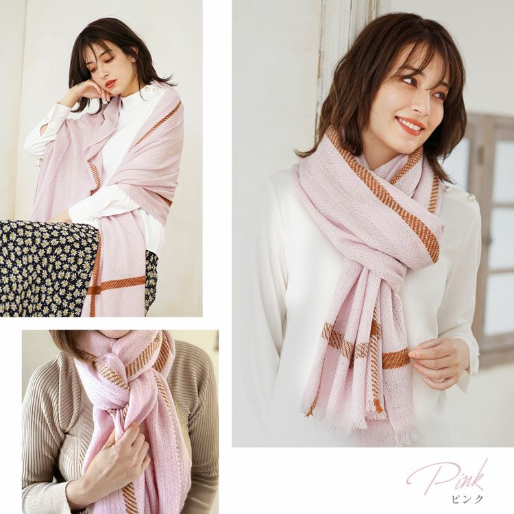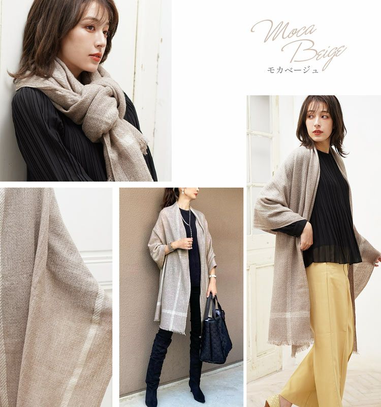 肩から羽織ってアウター代わりにも使える大判サイズで、季節の変わり目に重宝するアイテム。