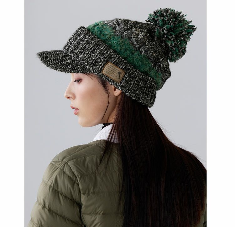 大きめのポンポンがアクセントになった、つば付きデザインのニット帽。