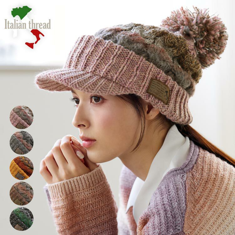 ニット帽 レディース ポンポン ニットキャップ つば付き ボンボン 秋冬 おしゃれ ニット 帽子 厚手 イタリア糸 イタリア製糸使用 カラフル つば付きニット帽 キャスケット 暖かい あたたかい つばつき 防寒
