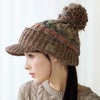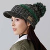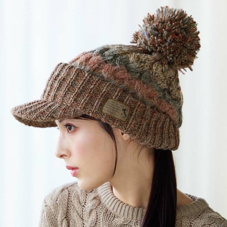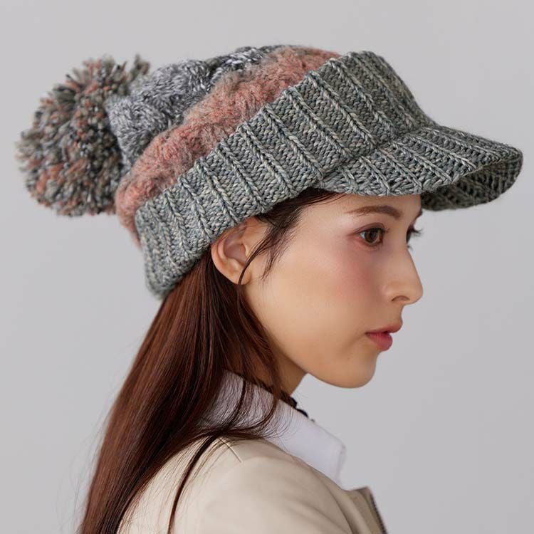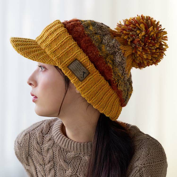 大きめのポンポンがアクセントになった、つば付きデザインのニット帽。