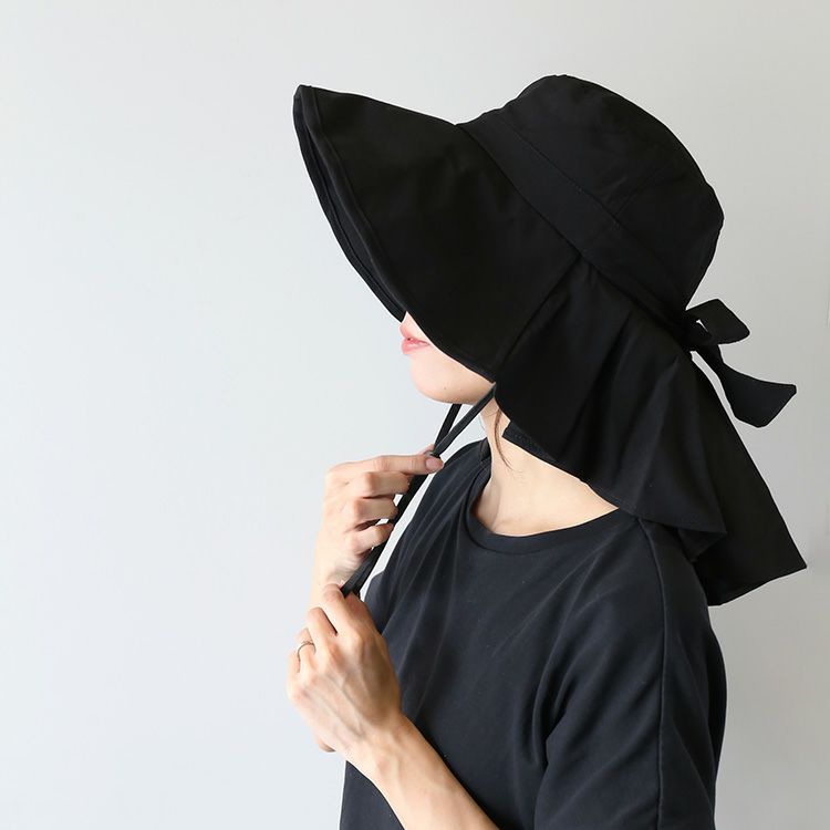 上品なつば広シルエットに、女性らしさを引き立てるリボンをあしらったエレガントなデザイン。首元までしっかり覆うタレ付き仕様で、360度日差しから守ります。