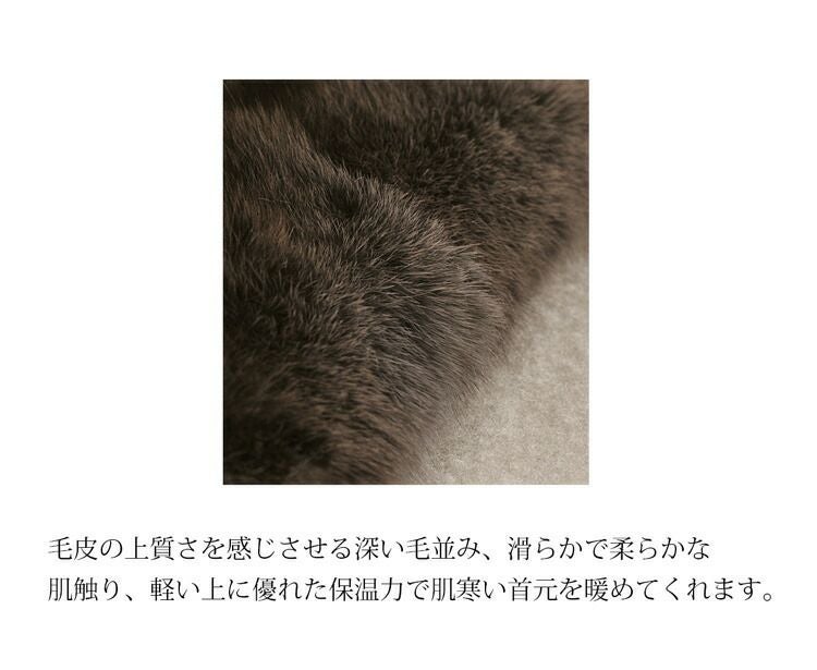 毛皮の上質さを感じさせる深い毛並み、滑らかで柔らかな肌触り、軽い上に優れた保温力で肌寒い首元を暖めてくれます。