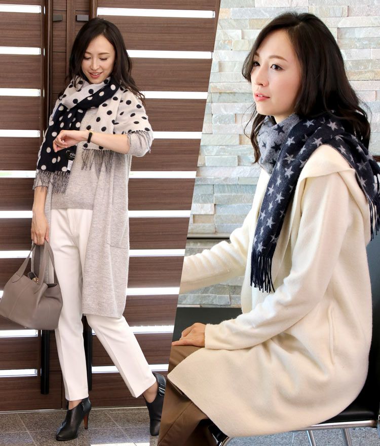 バレンタイン用に、家族や友人に買うためにカシミヤ100%のマフラーを探していて、迷彩のカーキとネイビーをセレクトし、ドットに一目惚れで自分用に購入しました。