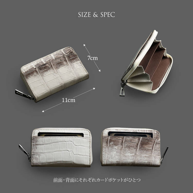 希少なヒマラヤクロコダイルの腑模様を活かしたコンパクトなラウンドファスナー小銭入れです。無駄をそぎ落としたミニマルなフォルムで、一点ごとに異なる表情をお楽しみいただけます。