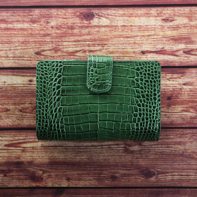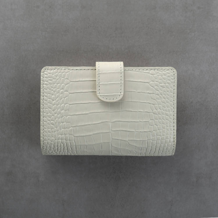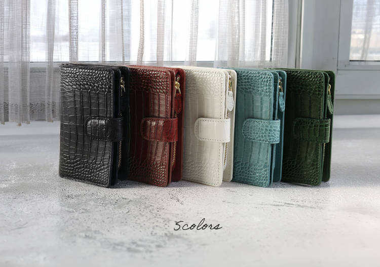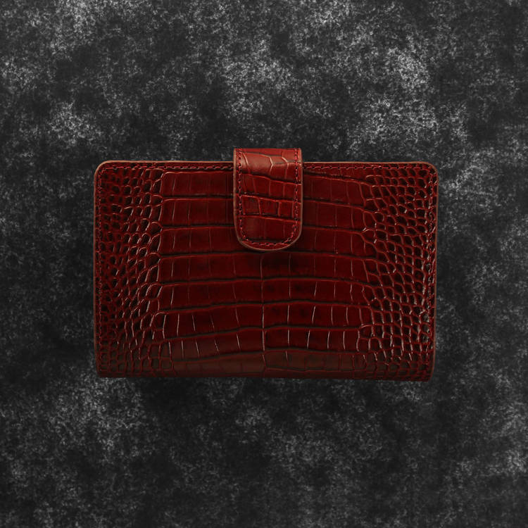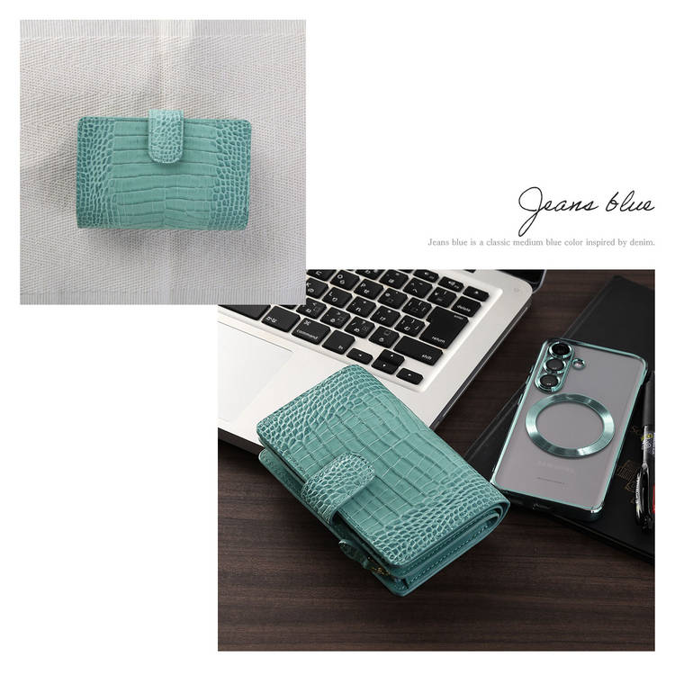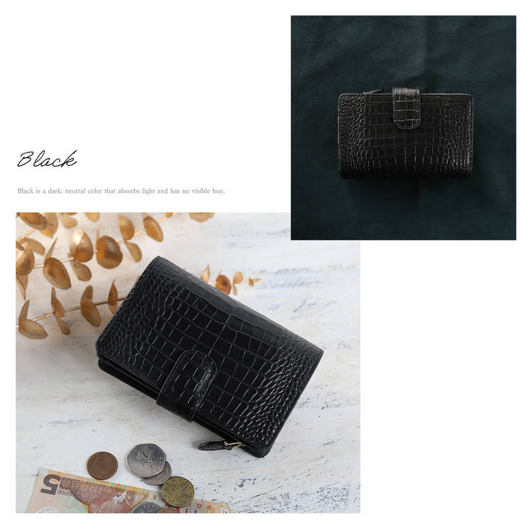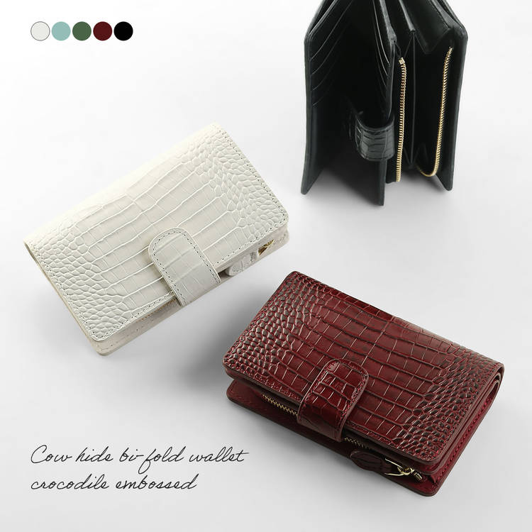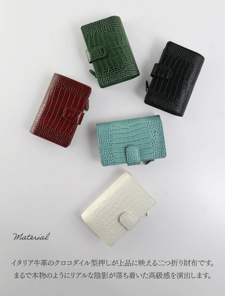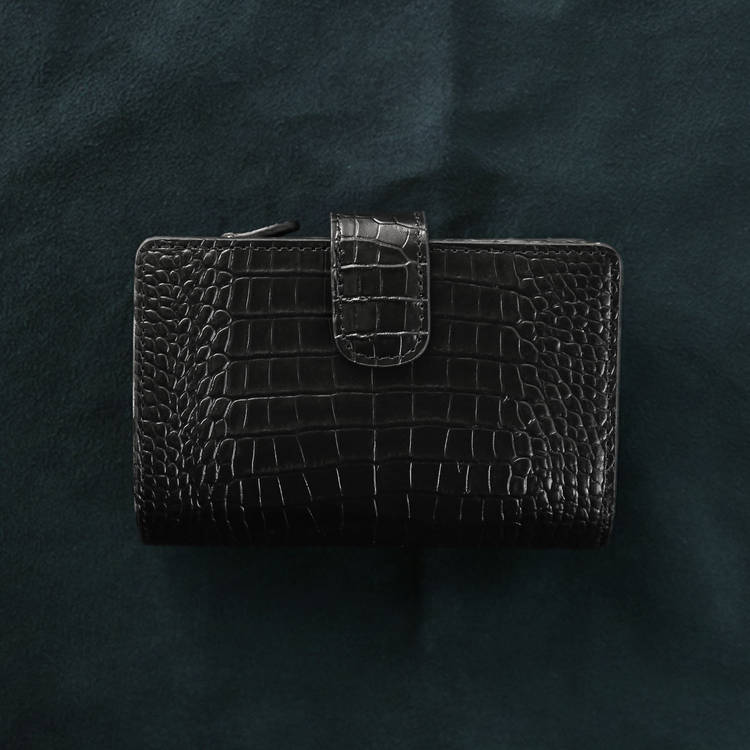 クロコダイル型押しの表情が印象的な、端正な二つ折り財布です。