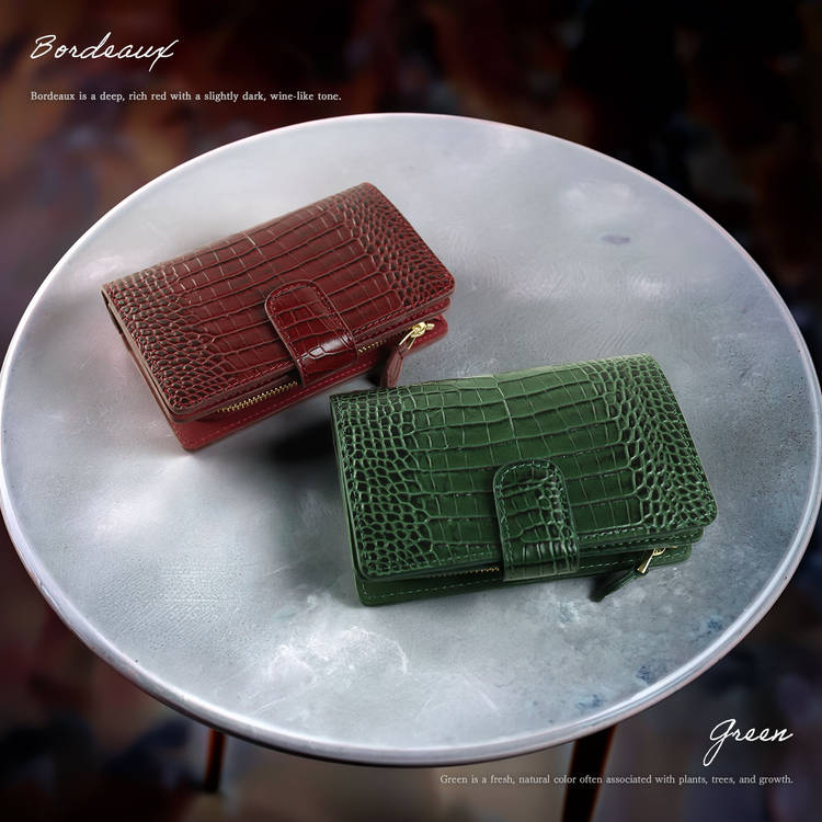 素材には牛革を使用し、外側はイタリア牛革のクロコダイル型押しが目を引きます。