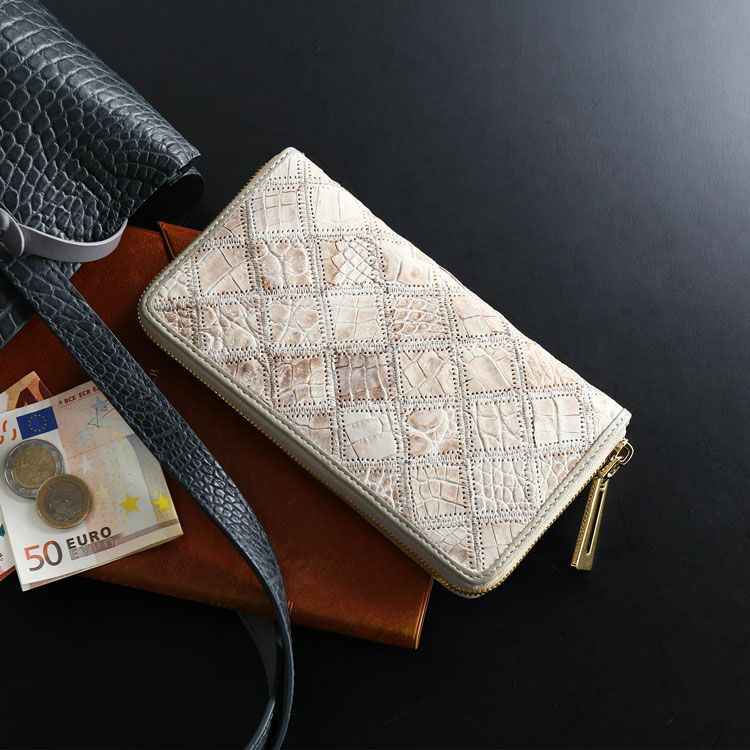 ヒマラヤ クロコダイル 長財布 レディース ラウンド ファスナー モザイク ステッチ 【ネコポスで送料無料】 本革 ゴールド 金具 ラウンド財布 レディース財布 ホワイトカラー 春財布 母の日 ギフト プレゼント
