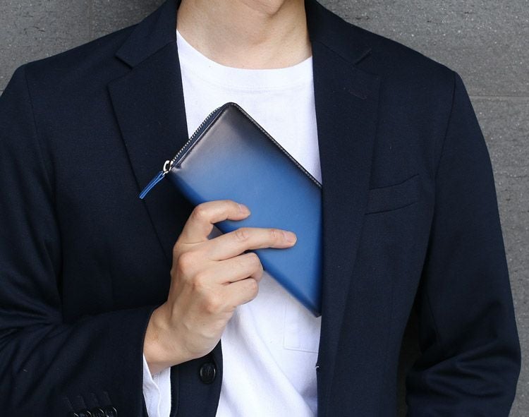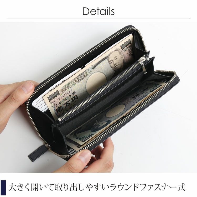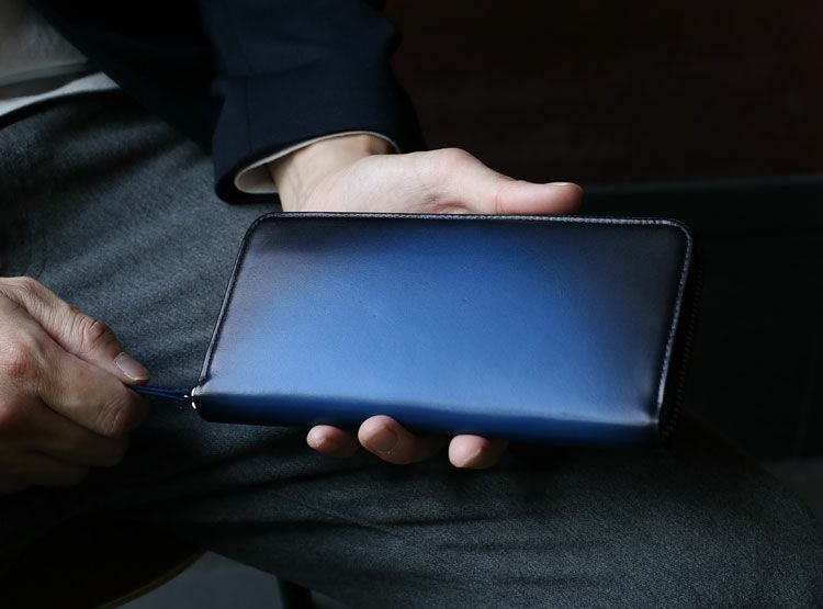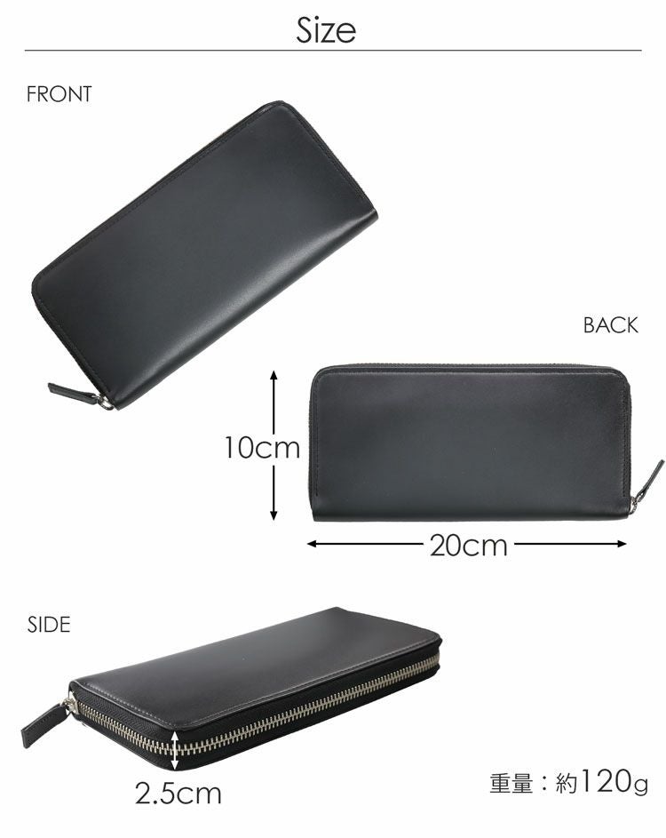 表革には日本職人の手作業によるシャドー加工を施した革を用いています。 型抜きした革1枚1枚に職人の手作業でエアーブラシによって吹き付けを施しています。 端から中央へ滑らかな濃淡を出していく作業は、職人の経験と技術のなせる業です。 硬く見えるデザインですが、使用している牛革はソフトで滑らかな手触りの牛革を使用。 思わず触れたくなる手触りと美しいグラデーションが魅力の財布です。 手に馴染む柔らかな触り心地。 美しいグラデーションが手元をオシャレに飾ります。 内装にMADE IN JAPANの文字が刻印されています。 日本製品の魅力として第一に挙げられるのが「作りの良さ」です。 日本特有の細やかで正確な作業は、 海外の職人には真似る事のできない日本が誇る伝統的な技術の一つです。 また、この緻密で正確な隙の少ない作りにより製品の耐久性が高く、 長く使えるというメリットがあり、世界中から日本製品はリスペクトされています。 開口部はラウンドファスナーで『コの字』型に大きく開きます。 内装は2つの紙幣入れと片マチファスナーの小銭入れで構成されています。 内側の前面と背面にカードホルダー×6とワイドポケット×1がそれぞれ付いています。 中央の小銭入れは片マチで大きく開き、小銭が取り出しやすい工夫が施されています。 専用の箱に入れてお届けします。 プレゼントにもおすすめのアイテムです。