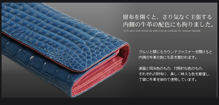 クロコダイルと牛革を使用し、2色の色使いが個性的なバイカラーデザインの長財布。