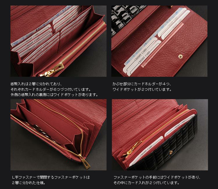 | 備考 | ・中央の仕切りはL字ファスナー付きポケットで、小銭の収納に便利です。 ・金具カラー/ゴールド ※内装のシャンタン生地のカラーはカラーバリエーションの画像を参考にしてください。 |