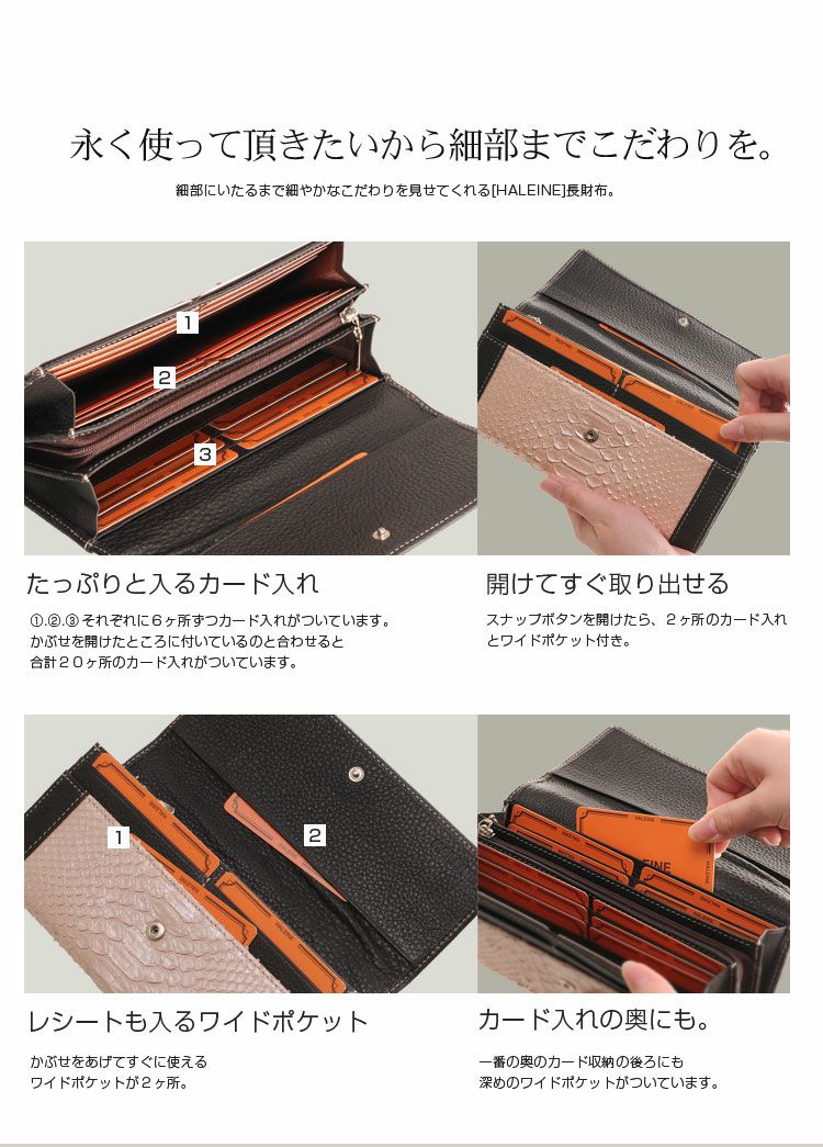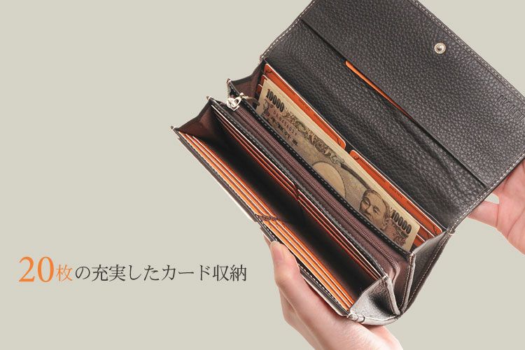 20ヶ所の充実したカード入れ、大きく開くL字ファスナーの小銭入れの内側には仕切り付き。