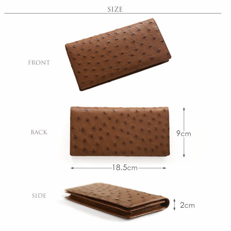 表:オーストリッチ 内側:オーストリッチ、牛革、合皮 ※内装は紙幣入れ内部に牛革、カードホルダーやその他ポケット内部に合皮を使用しています。 |