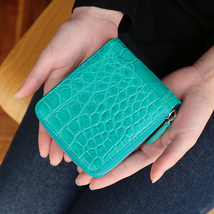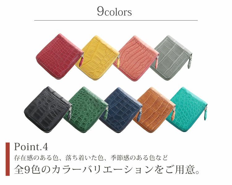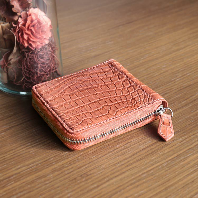 みんなが求める理想のコンパクト財布。 ラウンドファスナー開閉で中身をしっかり保護、 大きく開くので見やすく取り出し、会計もスムーズ。 ミニサイズながらもしっかりとした収納力。 憧れのクロコダイルレザーを多彩なカラーバリエーションの高品質・低価格で実現。 まさに『理想のコンパクト財布』 小さめのバッグにもコートのポケットにも入るコンパクトサイズ。 ファスナーを開けると安心のラウンドファスナー開閉。 掴みやすいふっくらとしたファスナーチャーム 内側:紙幣入れ×1、BOX型の小銭入れ×1、カードホルダー×5 外側:カードホルダー×1 その比類なき美しさから『皮革の宝石』と称されるクロコダイルの革を使用。 革には艶感を抑えたマット加工を施しています。 マット加工は使いながら革を育てるエイジング(経年変化)が魅力です。 使ってみたいけど予算が合わない、初めてのクロコダイルレザー製品など 『一度は使ってみたい憧れのクロコダイル』 そんな願いを叶えるためメーカーと協力しお求めやすい価格を実現しました。 当店でよく売れているカラーを厳選し製作しました。