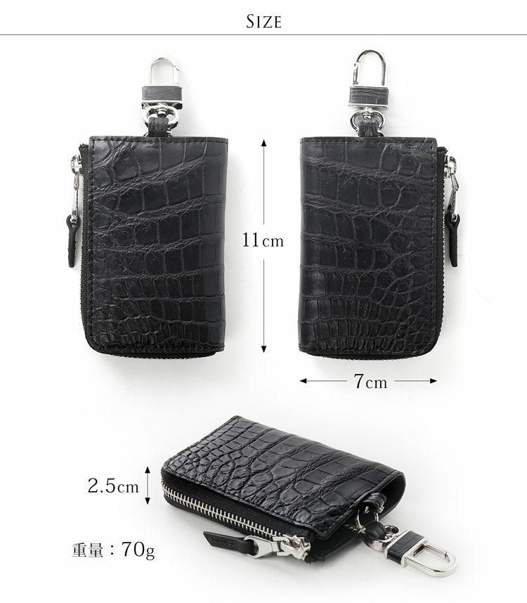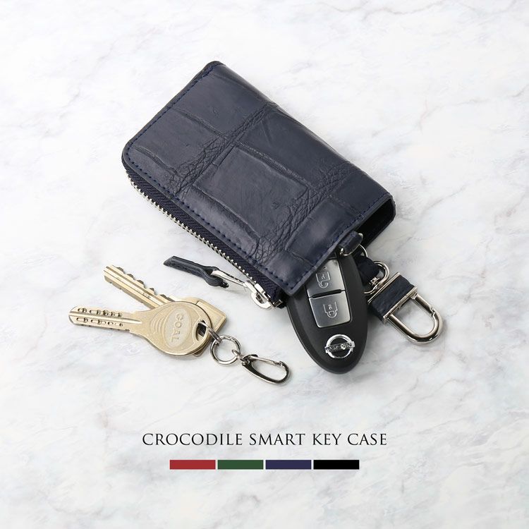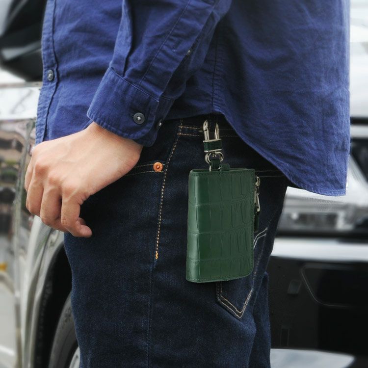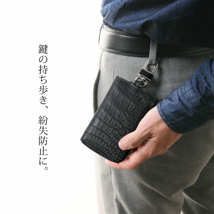 2つのリングで複数の鍵を 取り付けられるスマートキーケース。 車の鍵だけではなく、家や職場など 複数の鍵を持ち歩くのに便利なアイテムです。 鍵をそのままぶら下げたり、 ポケットに入れるのは傷や紛失の原因に。 カバーを付けることで鍵を保護できるので 安心して持ち歩けます。 『皮革の宝石』と称される クロコダイルの革を使っています。 艶感を抑え、落ち着いた表情が魅力の マット加工を施しています。 使い込むほどに本革ならではの 味のある表情に変わりゆく エイジング(経年変化)も魅力の素材です。 ワンタッチで簡単に取り付けられるフック付き。 バッグやベルトループなどに取り付ければ、 いつでも鍵をサッと取り出すことができます。 鍵穴に挿して使うシリンダー錠は、 左側のリングに取り付けるのがオススメ。 キーケース本体はバッグやベルトループに着けたまま 必要な鍵だけ取り出すことができるので、 鍵の施錠や家族と共有する際にも便利な機能です。 内側にはカードホルダーがあるので、 カードキーやICカードも収納できます。 クロコダイルの表情を生かした シンプルなデザインなので、 男女問わず長く使うことができます。