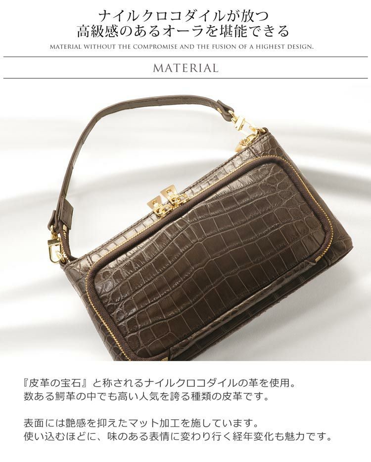 | 素材 | 表側:クロコダイル 内装:シャンタン生地 (ハンドルの裏側やショルダーベルトは牛革を使用しています。) |